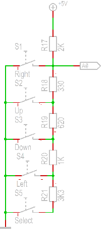 Statt 5 digitale Leitungen für die 5 Taster zu „verschwenden“ nehmen wir einfach einen analogen Eingang. Je nach Spannung wissen wir, welche Taste gedrückt worden ist.Das kann zwar noch erweitern, jedoch wird es dann immer schwieriger die Tatse einwandfrei zu identifizieren. Denn sowohl die Widerstände haben Toleranzen wie auch der A/D Wandler wie auch die Spannungsversorgung. Das alles addiert sich und deswegen ist bei dem einen die Taste für DOWN bei 350, beim anderen schon bei 300. Wenn man das für sich selber macht, kann man ja die Werte entsprechend anpassen. Bei der veröffentlichung würde ich zumindest drauf hinweisen, wie man das kalibriert. Bei 5 Tasten sollte das aber bei jedem funktionieren.