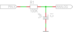 Die Ausgänge sind mit PWM bezeichnet. Weil dort natürlich kein echtes analoger Pegel anliegt, das kann der Arduino nicht, sondern ein pulsweitenmoduliertes Signal (Näheres findet man hier). Für viele Anwendungen ist das Signal schon so verwendbar. Beispielsweise um die Helligkeit einer LED zu verändern. Oder einen Motor zu steuern. Die Frequenz vom Arduino liegt bei ca. 500Hz. Aber das PWM Signal läßt sich auch leicht in eine echte Spannung umwandeln. Dazu reicht ein Kondensator und ein Widerstand, der dann einen sog. Tiefpass bildet. Hier die Schaltung, die ich gerne verwende: