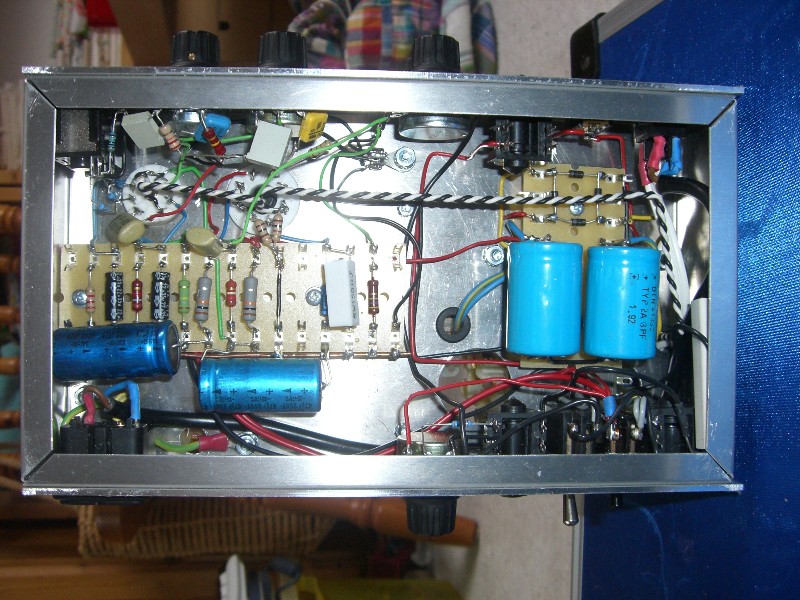 Die Idee zu dem Amp kam mir beim Lesen des Buches Audio und Gittarrenschaltungen mit Röhren vom R. zur Linde. Als Grundlage diente ein Bausatz der Firma Welter. (Wird leider nicht mehr angeboten. Habe aber für alle benötigten Teile Alternativen.) Von der ursprünglichen Schaltung ist nicht mehr viel übrig geblieben.
