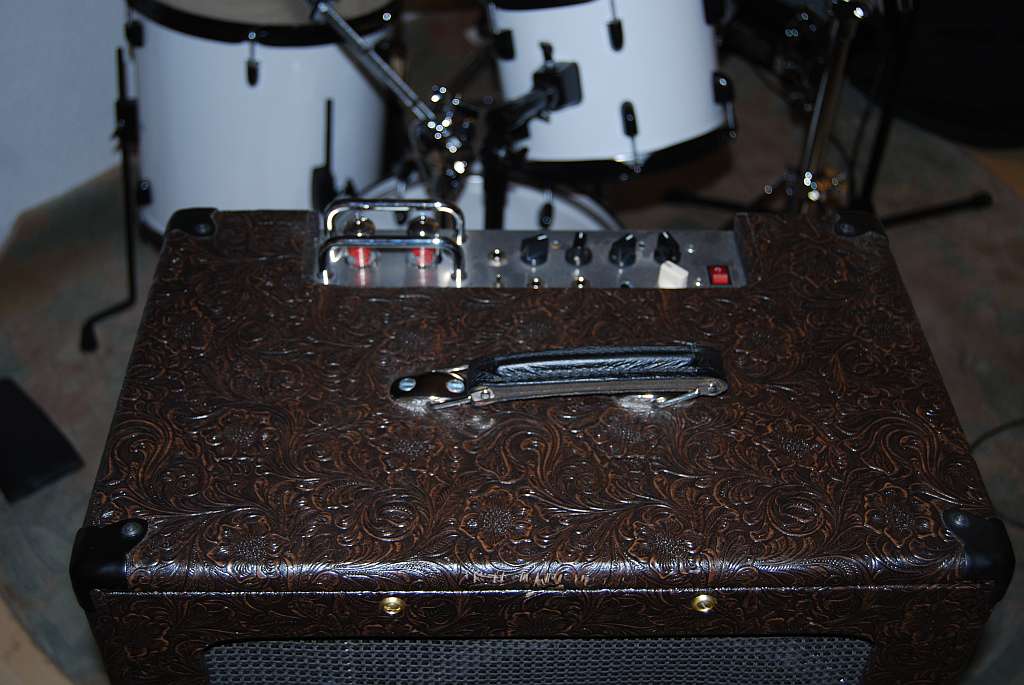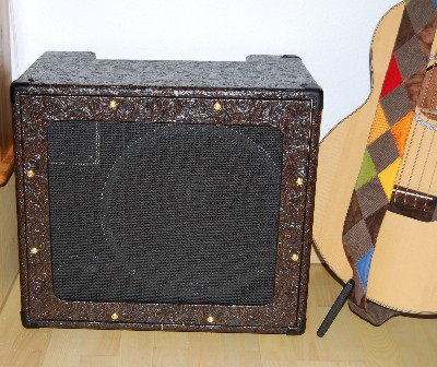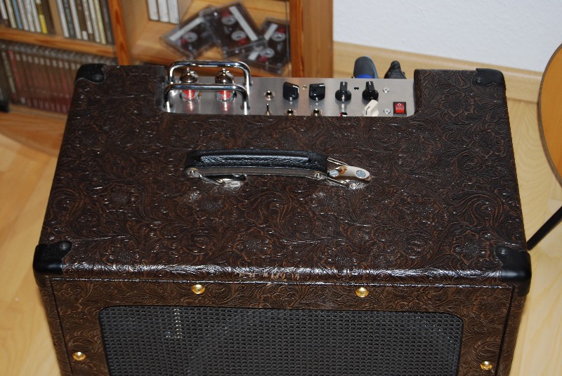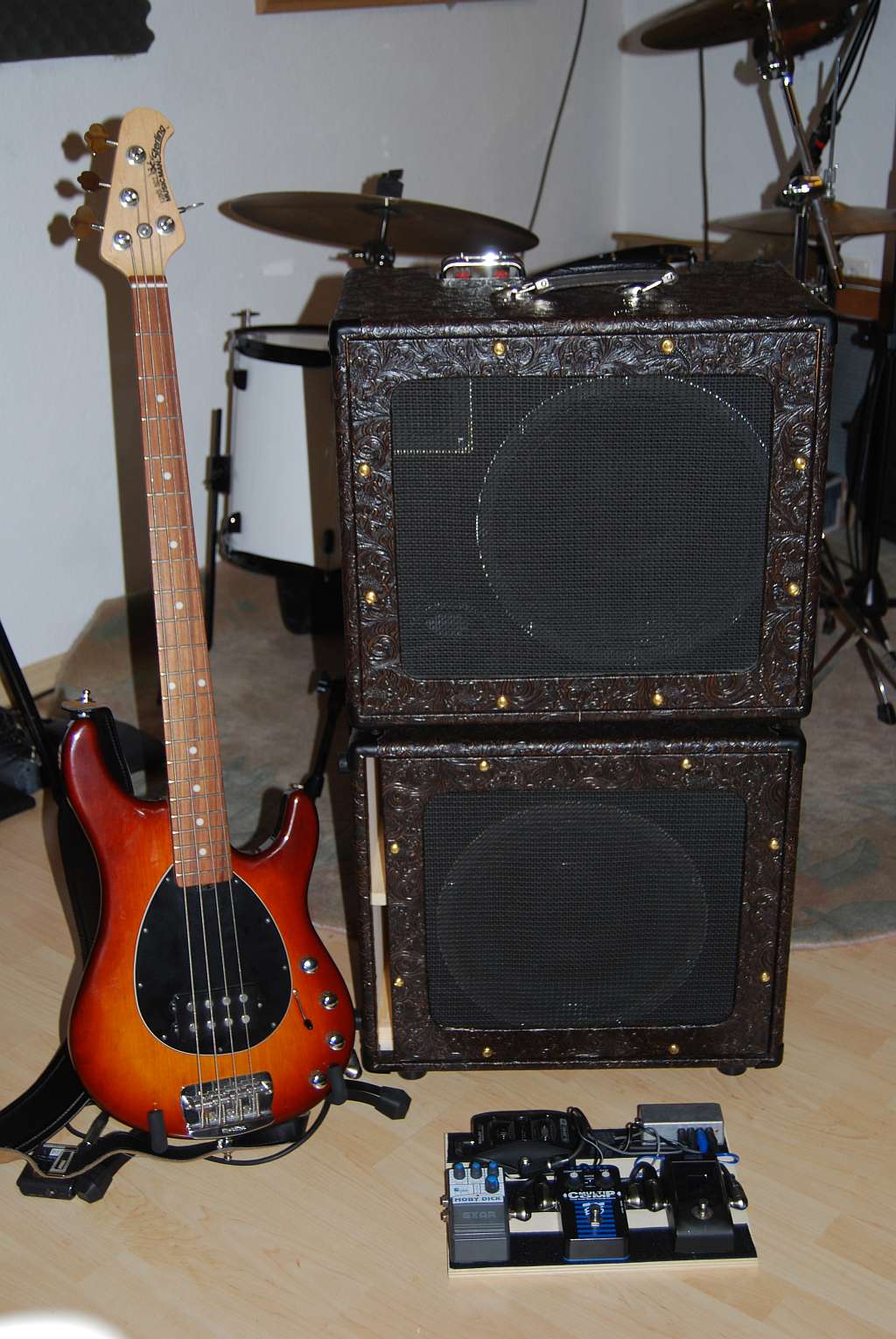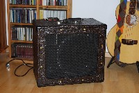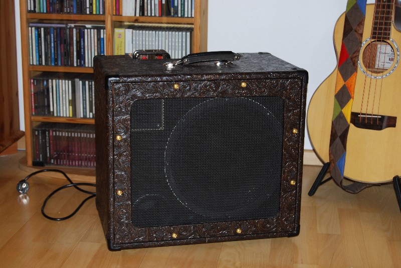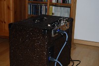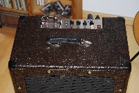 Hurra, ich habe den Amp endlich spielfertig. Kurzentschlossen, wegen dem guten Klang des HiWatt Nachbaues, habe ich den Preamp auf Basis Fender Pre durch einen HiWatt Klon ersetzt. Näheres auf Anfrage. Der Klang ist ziemlich fett, drückend und doch sehr transparent. Das Horn bruach ich nur ganz minimal aufdrehen, unter anderem auch, weil ich die Mitten von dem eingebauten Eminence Deltalite 2512 mit einem Filter (Einfacher Filter mit Parallelschaltung von 6,8mH, 68uF und 15Ohm 10W Widerstand) gedämpft habe. Hier mal ein paar Fotos vom derzeitigen Stand: