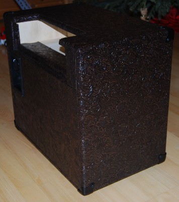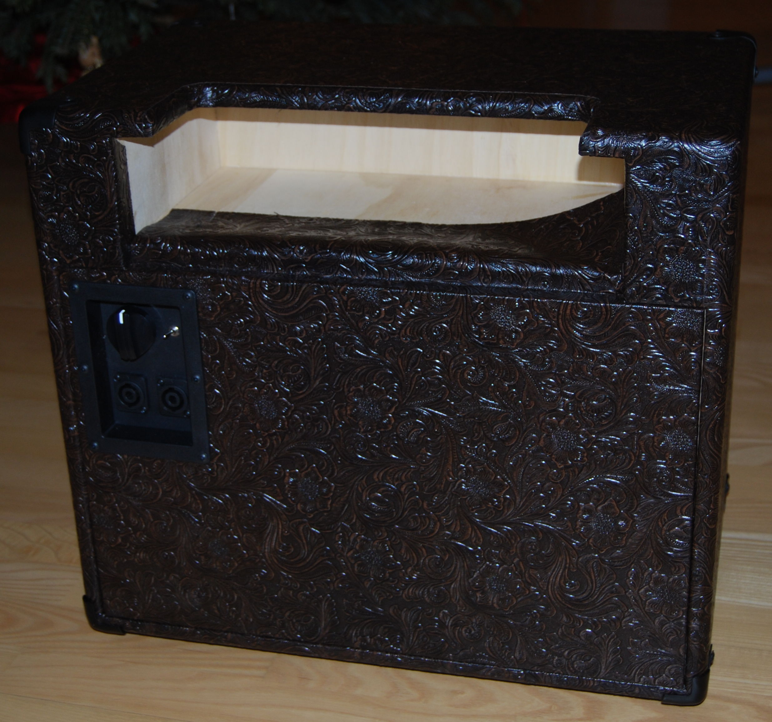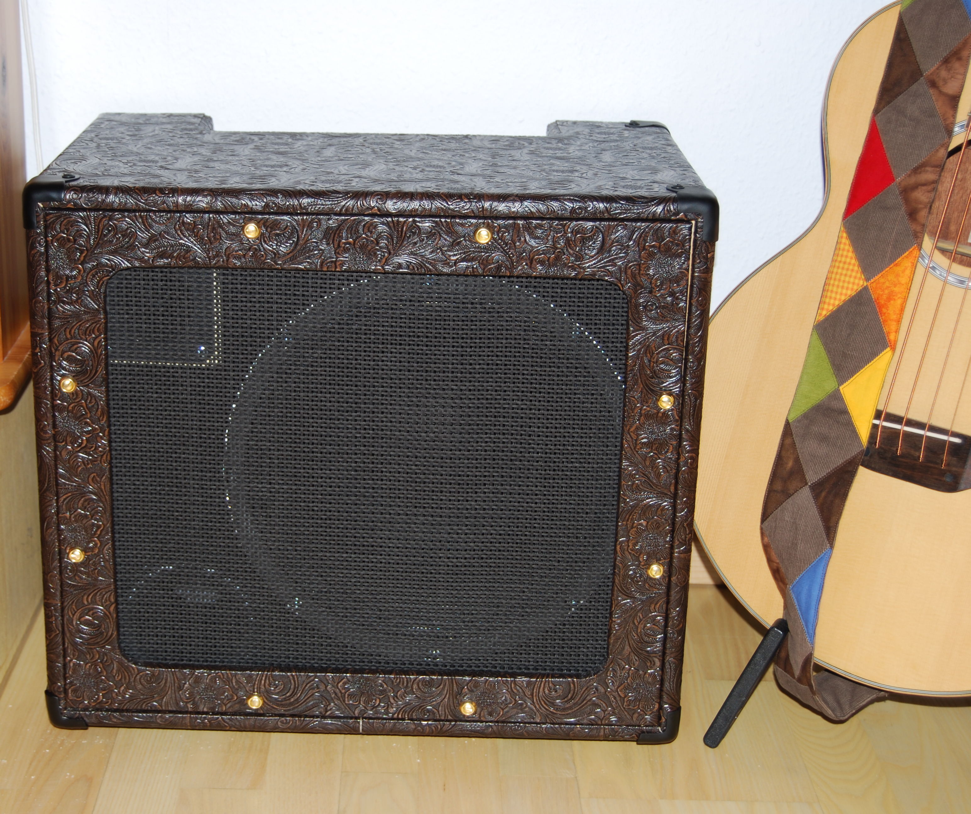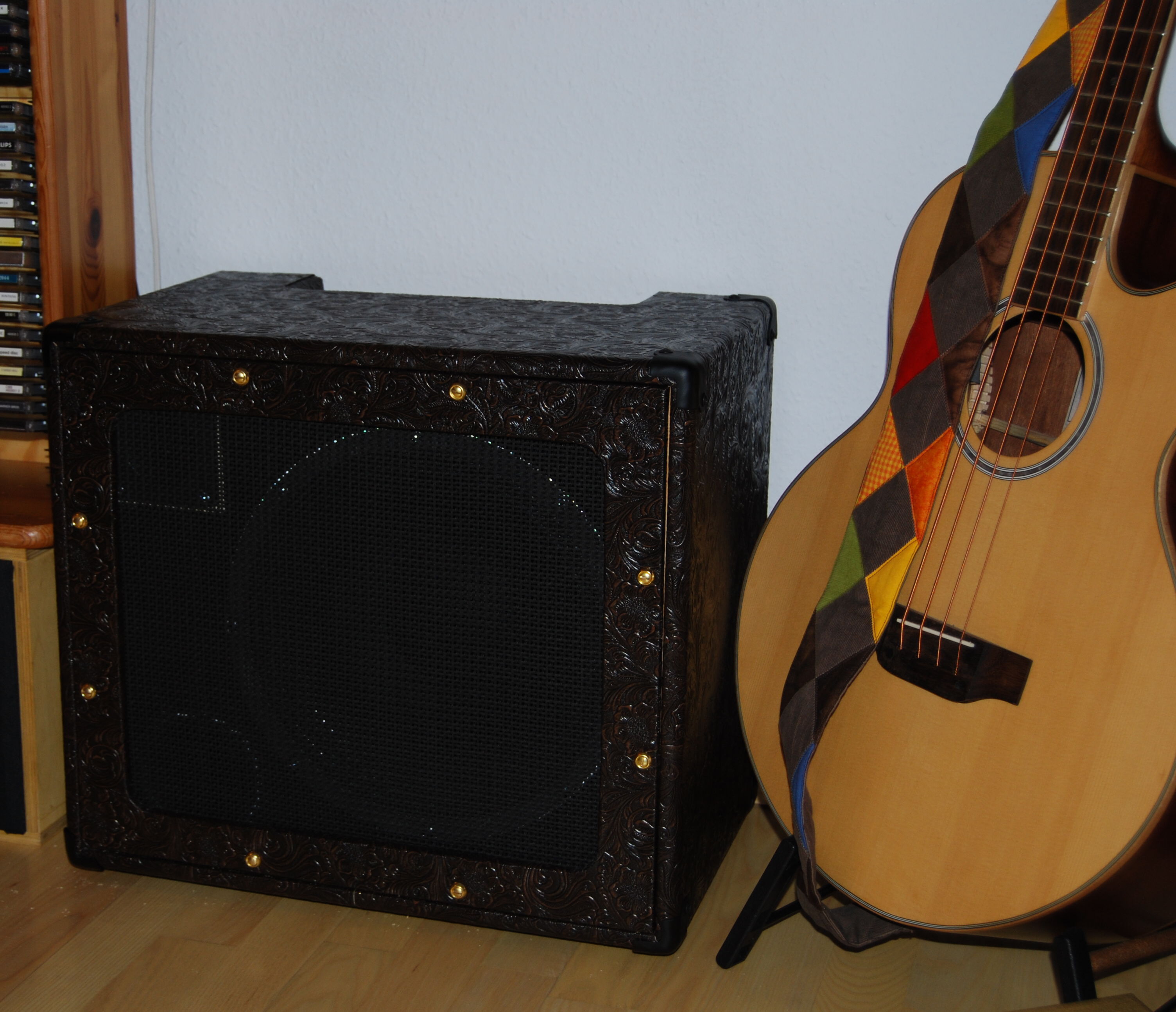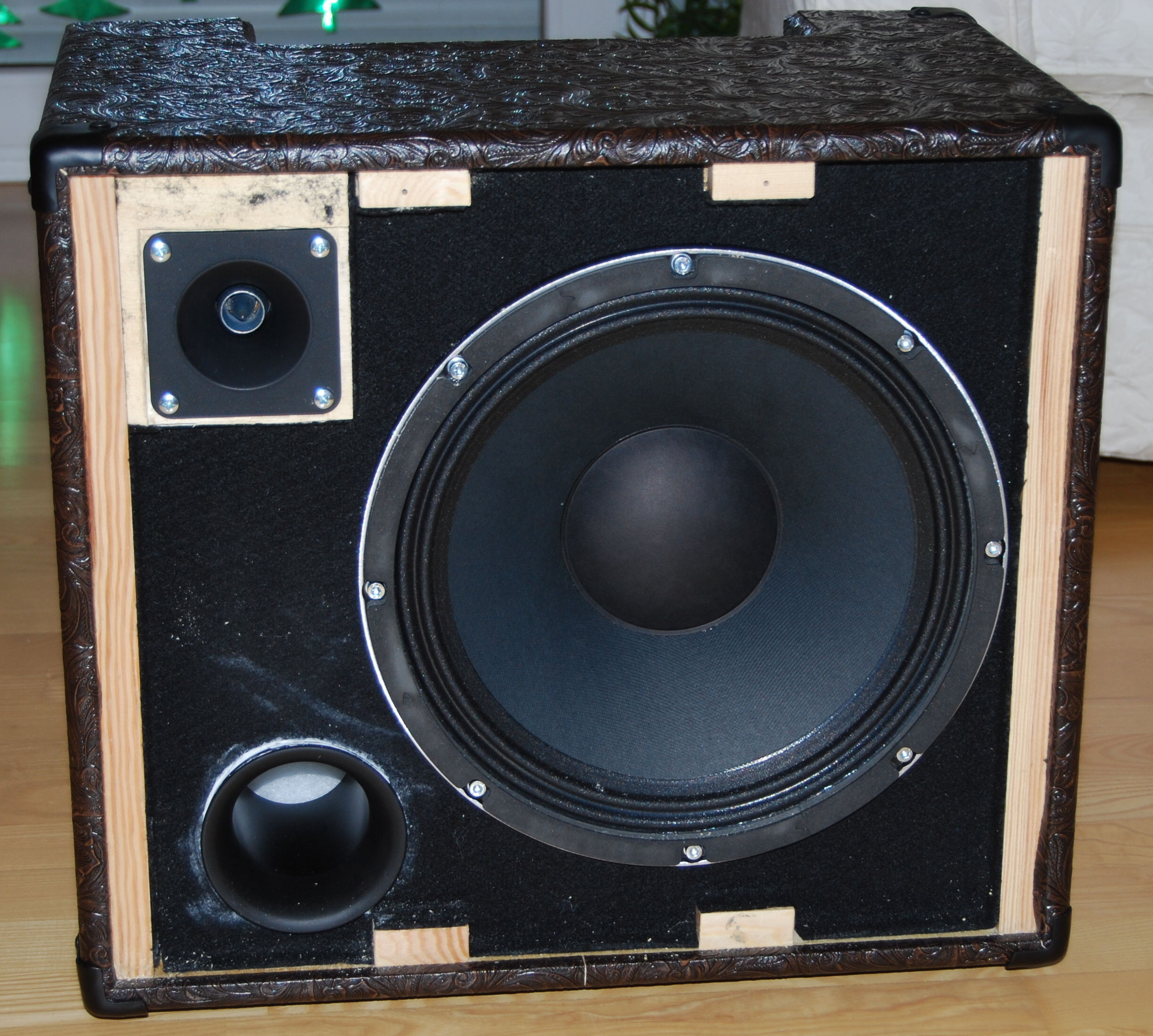 Dummerweise sieht man im Blitzlicht viel mehr als bei normalen Lichtverhältnissen. Die Speaker scheinen hier sehr deutlich durch, auch die kleinen Fehler, bzw. wo noch ein bisschen Tolex oder Filz fehlt. Aber das wird noch behoben.