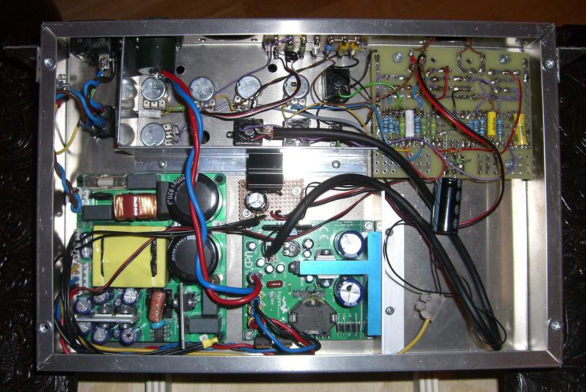 Hinten sieht man noch die Löcher für die Entlüftung. Gitter hab ich zwar schon, finde Sie aber nicht... :-( Der Amp von innen: