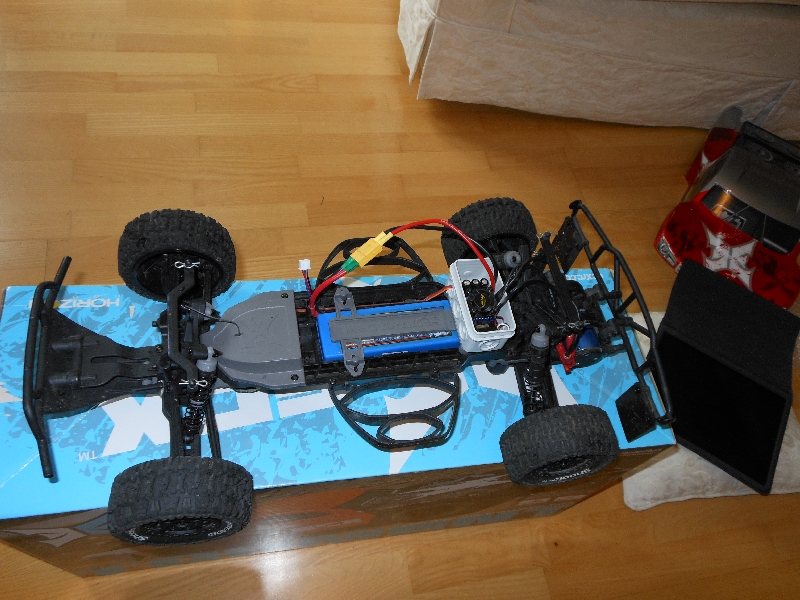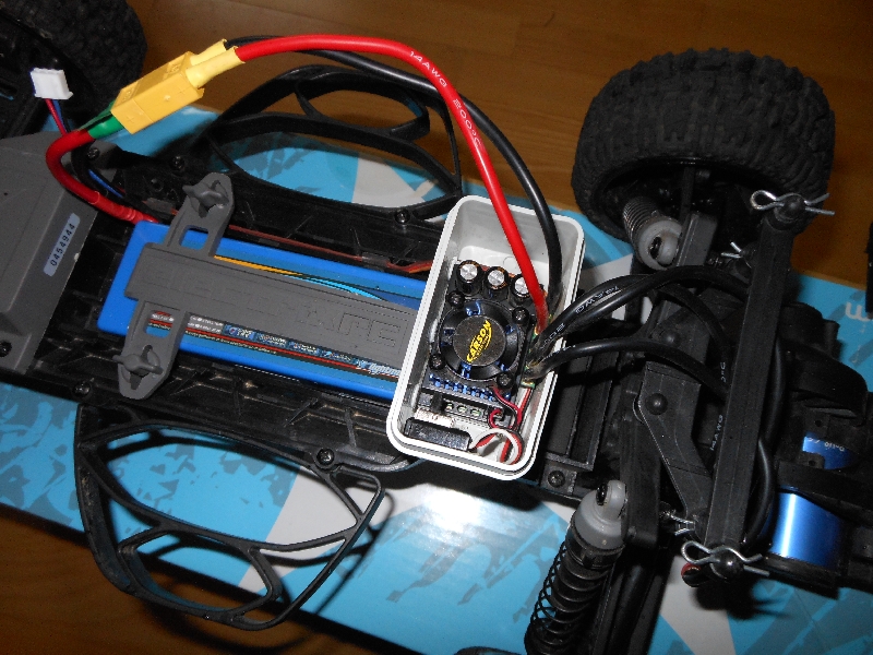 Der Truck war mit dem Motor kaum schneller unterwegs, zwar zog er etwas besser die Hügel hoch, aber Endgeschwindigkeit war eher mau. Allerdings der Akku hielt deutlich länger. Also mal ein paar andere Akkus ausprobiert. Und siehe da mit LiPo's (2s und vor allem 3s) kam schon mal ein deutlicher Schub ins Ganze. Aber du mußte doch noch mehr gehen. Also eine Woche später in den Laden und ein paar Sachen nachgekauft. 8T Motor, Ritzel auf 20'er vergrößert. Inzwischen waren dann auch die Akku's da, Lipo 2S1P 20C 5000 in HArdcase von HK.